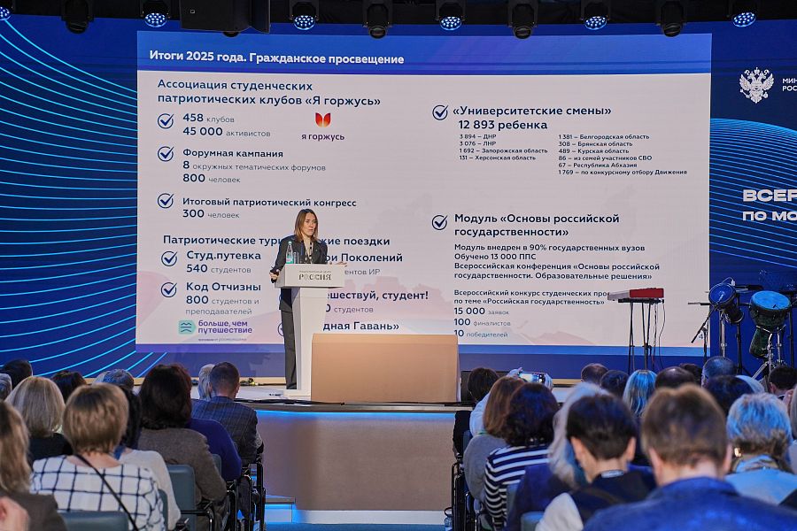 18 декабря в Национальном центре «Россия» прошло открытие второго дня Конгресса. Были подведены итоги реализации молодежной политики в 2025 году, представлены результаты мониторинга воспитательной деятельности и определены стратегические направления на 2026 год. Также прошла церемония награждения Конкурса команд вузов по молодежной политике и воспитательной деятельности.