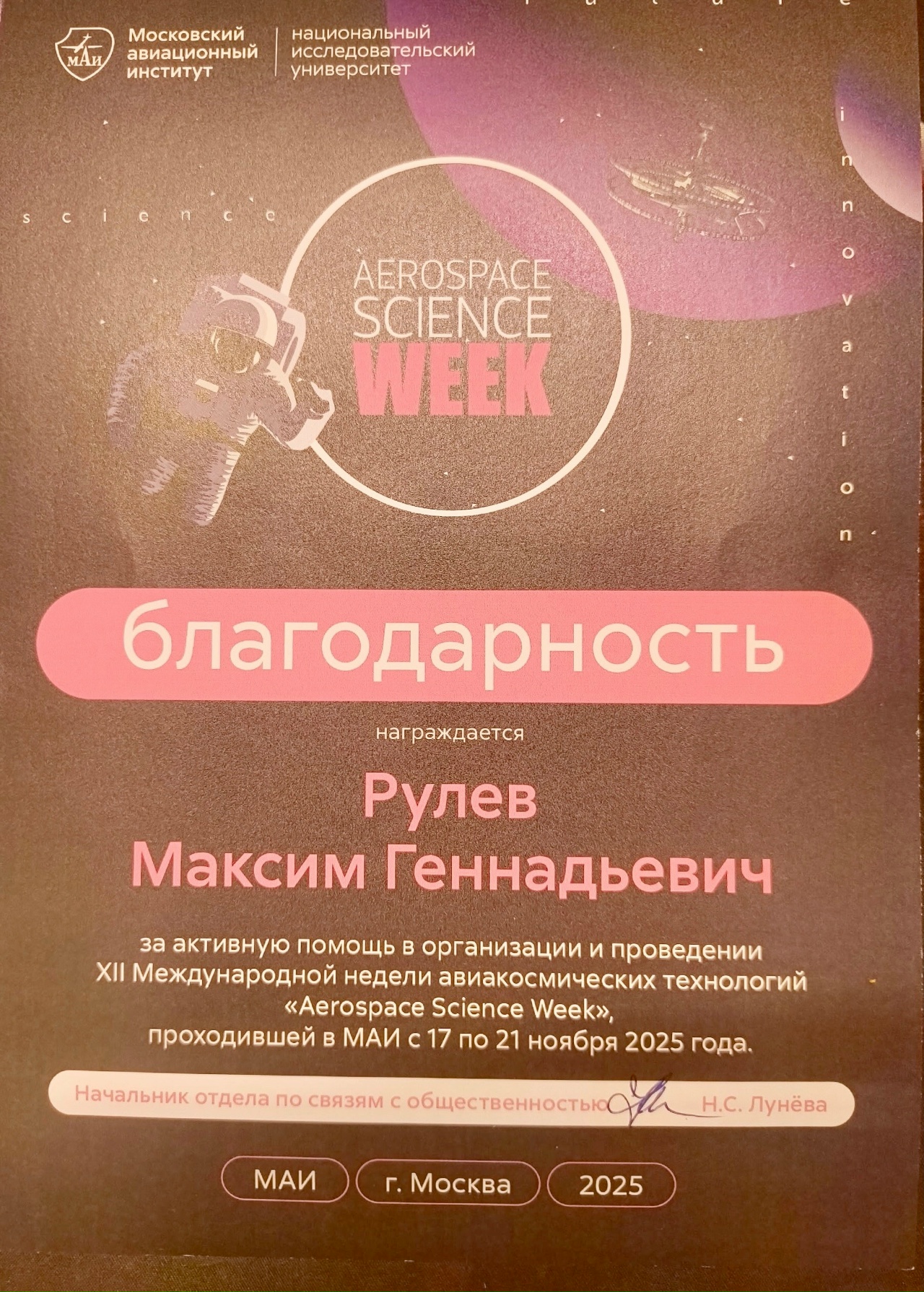 Особую благодарность и.о. директора Виктор Уваров вручил волонтерам Максиму Рулёву, Артему Коновалову и Константину Пятову — за активную помощь в организации и проведении XII Международной недели авиакосмических технологий «Aerospace Science Week», проходившей в МАИ с 17 по 21 ноября 2025 года.