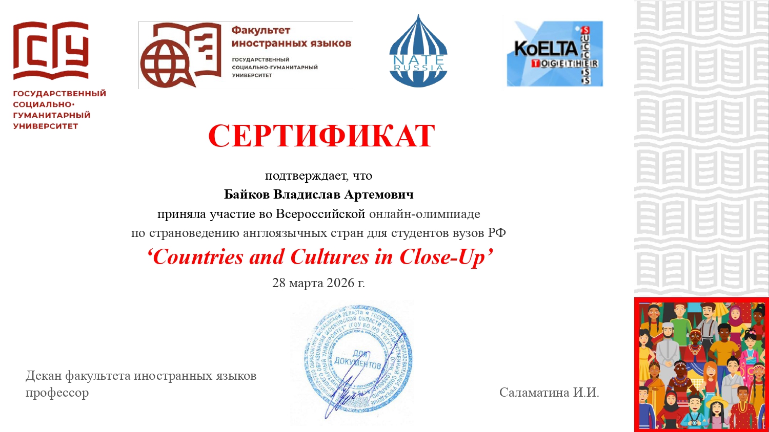 28 марта 2026 года кафедра лингвистики и межкультурной коммуникации факультета иностранных языков ГОУ ВО МО «ГСГУ» провела ежегодную Всероссийскую онлайн-олимпиаду по страноведению англоязычных стран «Countries And Cultures In Close-Up» для студентов ВУЗов РФ. В олимпиаде приняли участие 456 учащихся из г. Москвы и Московской области (г. Воскресенск, г. Кашира, г. Клин, г. Красногорск, г. Коломна, г. Королѐв, г. Московский, г. Орехово Зуево, г. Ступино), а также из других населенных пунктов РФ: из г. Волгоград (Волгоградская область), г. Воронеж (Воронежская область), г. Георгиевск (Ставропольский край), г. Екатеринбург (Свердловская область), г. Иваново (Ивановская область), г. Казань (Республика Татарстан), г. Калуга (Калужская область), г. Кострома (Костромская область), г. Красноярск (Красноярский край), г. Курск (Курская область), г. Московский (Кировская область), г. Новосибирск (Новосибирская область), г. Норильск (Красноярский край), г. Омск (Омская область), г. Оренбург (Оренбургская область), г. Пермь (Пермский край), г. Пятигорск (Ставропольский край), г. Рязань (Рязанская область), г. Самара (Самарская область), г. Санкт-Петербург (Ленинградская область), г. Саратов (Саратовская область), г. Смоленск (Смоленская область), г. Сочи (Краснодарский край), г. Сыктывкар (Республика Коми), г. Таганрог (Ростовская область), г. Тюмень (Тюменская область), г. Уфа (Республика Башкортостан), г. Чебокрасы (Чувашская область), г. Челябинск (Челябинская область), г. Чита (Забайкальский край), г. Ярославль (Ярославская область), г. Шуя (Ивановская область), что свидетельствует об обширной географии мероприятия.
