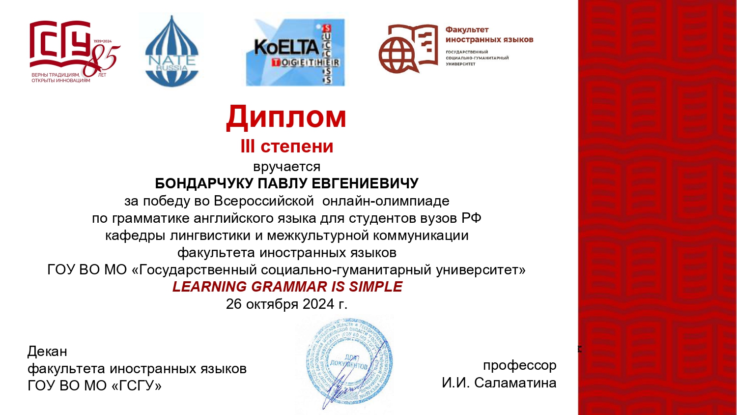 Студенты СФ МАИ в количестве 70 человек 26 октября 2024 г. приняли участие в олимпиаде «LEARNING GRAMMAR IS SIMPLE», которая проводилась Кафедрой лингвистики и межкультурной коммуникации факультета иностранных языков ГОУ ВО МО «Государственный социально-гуманитарный университет» г. Коломна.