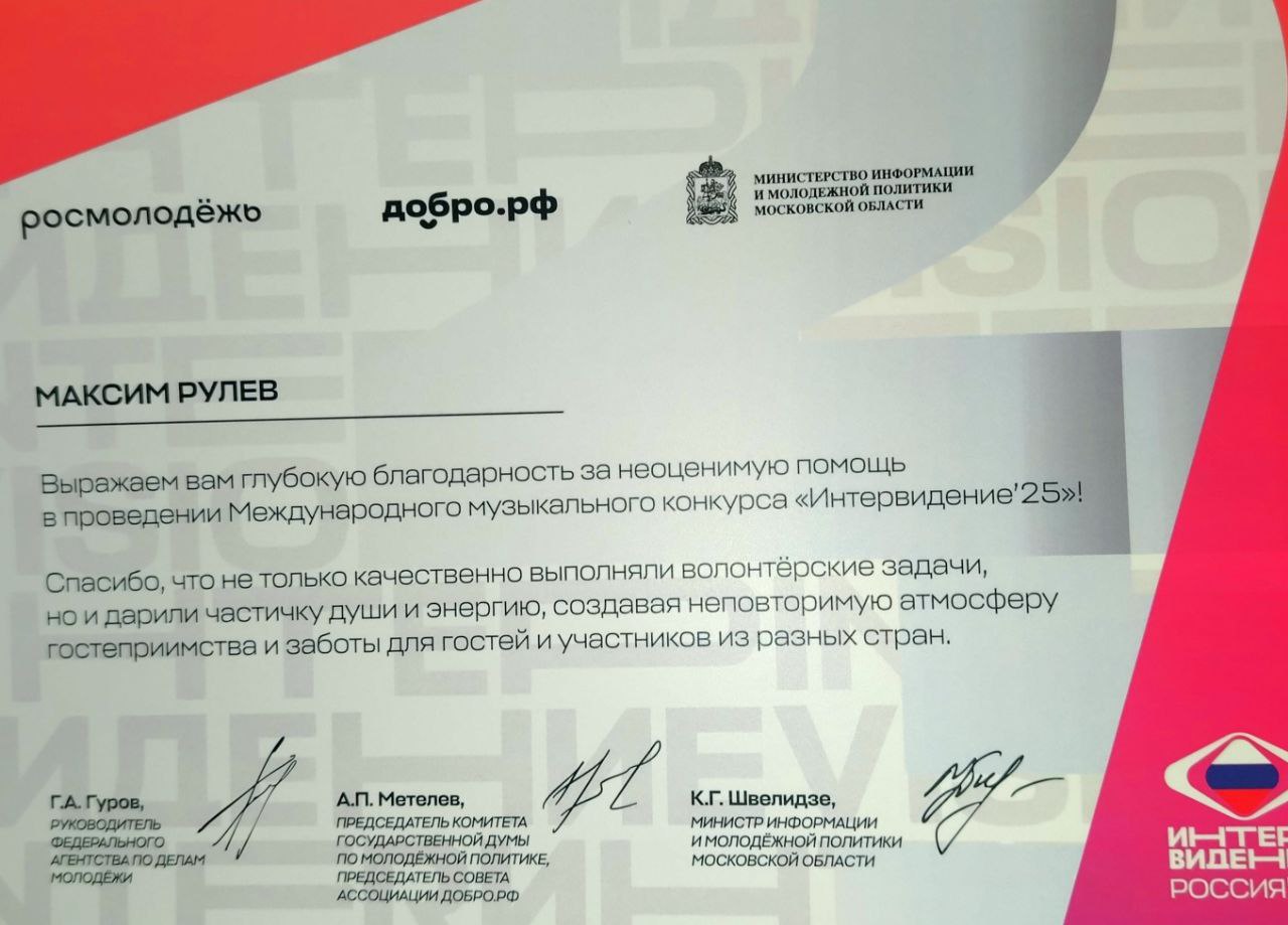 «Волонтёрская деятельность на “Интервидении” стала для меня не просто строчкой в портфолио, а мощным катализатором в общественной жизни. За моим подразделением был закреплён участок “Сервисы для зрителей”. Мы помогали в организации мероприятия и получили уникальную возможность заглянуть в закулисье такого масштабного шоу. Увидеть, как слаженно работает огромная команда профессионалов, – это бесценно! Ведь «Интервидение» действительно поражает своим размахом: участие в нём приняли звёзды мировой величины, представители медиаиндустрии из десятков стран, тысячи зрителей наблюдали шоу в зале и миллионы — в прямом эфире. Самым тёплым воспоминанием стало живое общение с ребятами из волонтёрского штаба. Уверен, что мы сохраним дружеские отношения и будем встречаться на новых проектах. Участие в «Интервидении» стало для меня честью и огромным источником вдохновения, которое я обязательно применю в нашей университетской волонтёрской команде" - поделился впечатлениями Максим