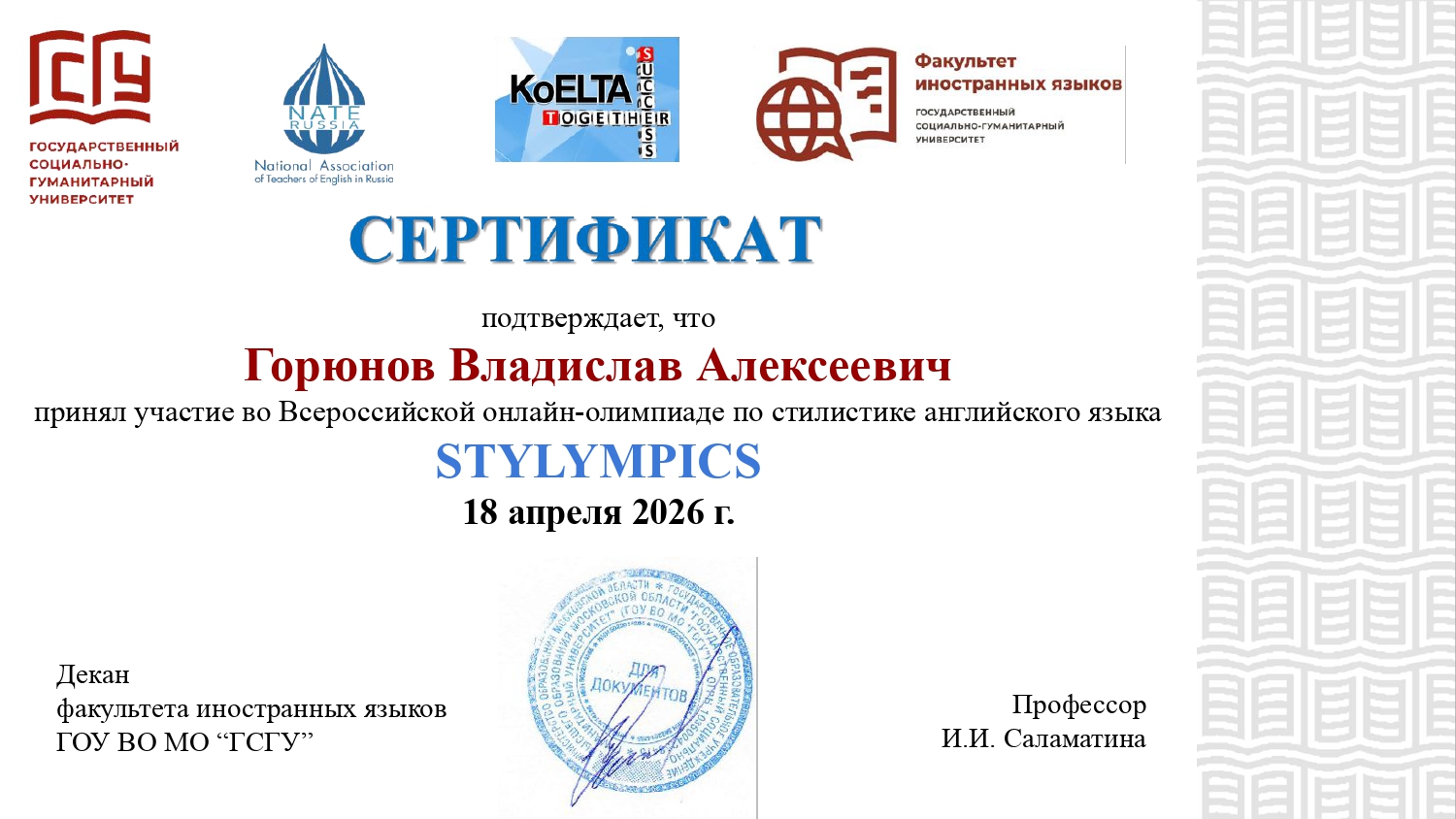 18 апреля 2026 года на базе ГОУ ВО МО «Государственный социально-гуманитарный университет» прошла традиционная онлайн-олимпиада по стилистике английского языка Stylympic-26s, которую подготовила команда преподавателей факультета иностранных языков в составе зав. кафедрой лингвистики и межкультурной коммуникации факультета иностранных языков, доцента С.А. Резцовой, доцентов Ю.С. Черняковой и С.С. Шумбасовой. В стилистическом марафоне прияли участие 259 студентов вузов Москвы (МГТУГА, МИСИС) и Московской области (ГСГУ, Ступинский филиал МАИ в количестве 37 человек, КИ МПУ, Звенигородский ФЭ колледж при правительстве РФ); других областей Центрального ФО: Липецкой (ЛГПУ им. П.П. Семѐнова-Тян-Шанского), Смоленской (СГУ), Воронежской (ВГУ), Костромской (КГУ); Приволжского ФО: Удмуртской Республики (ГИПУ им. В.Г. Короленко), Республики Татарстан (Казанский филиал РГУП им. В.М. Лебедева), Республики Башкортостан (БГПУ им. М. Акмуллы), Самарской (ПГУТИ) и Ульяновской (УГУ) областей; Сибирского ФО: Томской (НИ ТГУ) и Новосибирской (НПГУ) областей; Южного ФО: Саратовской области (СГМУ им. В.И. Разумовского) и Краснодарского края (СГУ).